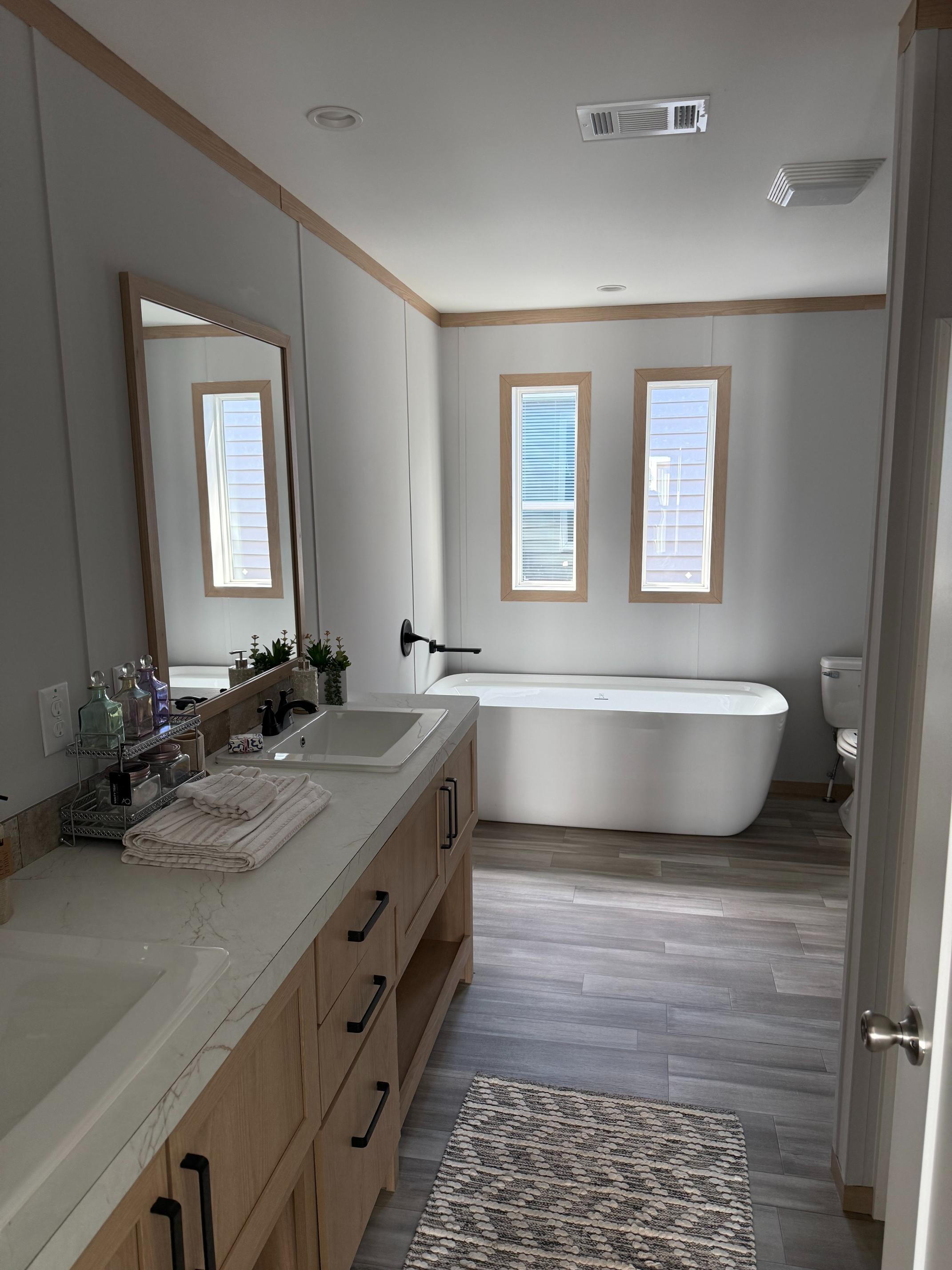 Bathrooms Info: Dual Lever Black Faucets in Both Baths / Single Lever Black Faucet on Showers & Tub/Showers / Framed Mirror Treatment Both Baths / 60” Fiberglass Shower in Master Bath / Fiberglass Tub/Shower in Guest Bath / Elongated Toilets in Both Baths / Single Row Ceramic Tile Backsplash at Sinks / Free-Standing Soaker Tub w/ (2) 14” x 42” Fixed Windows in Master Bath / Dual Sink Vanity w/ Cubby Storage in Master Bath